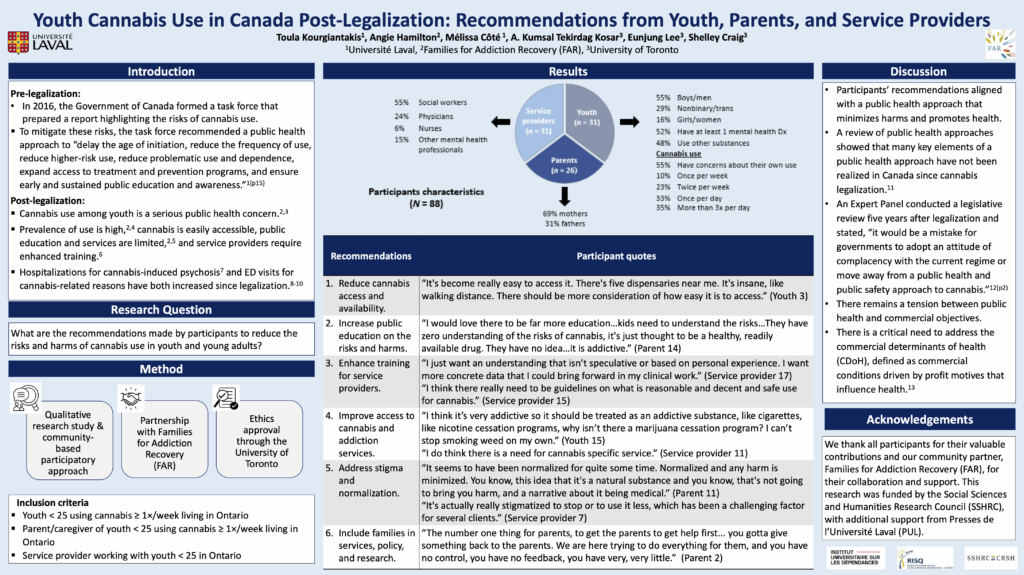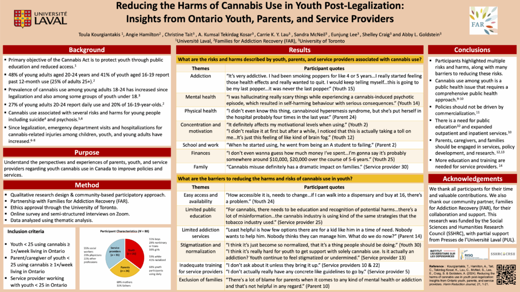 Kourgiantakis, T., Hamilton, A., Tait, C., Tekirdag Kosar, K., Lau, C., McNeil, S., Lee, E., Craig, S. & Goldstein, A. (2024). Reducing the harms of cannabis use in youth post-legalization: Insights from Ontario youth, parents & service providers. 21(193), 1-21. Harm Reduction Journal. https://doi.org/10.1186/s12954-024-01112-9